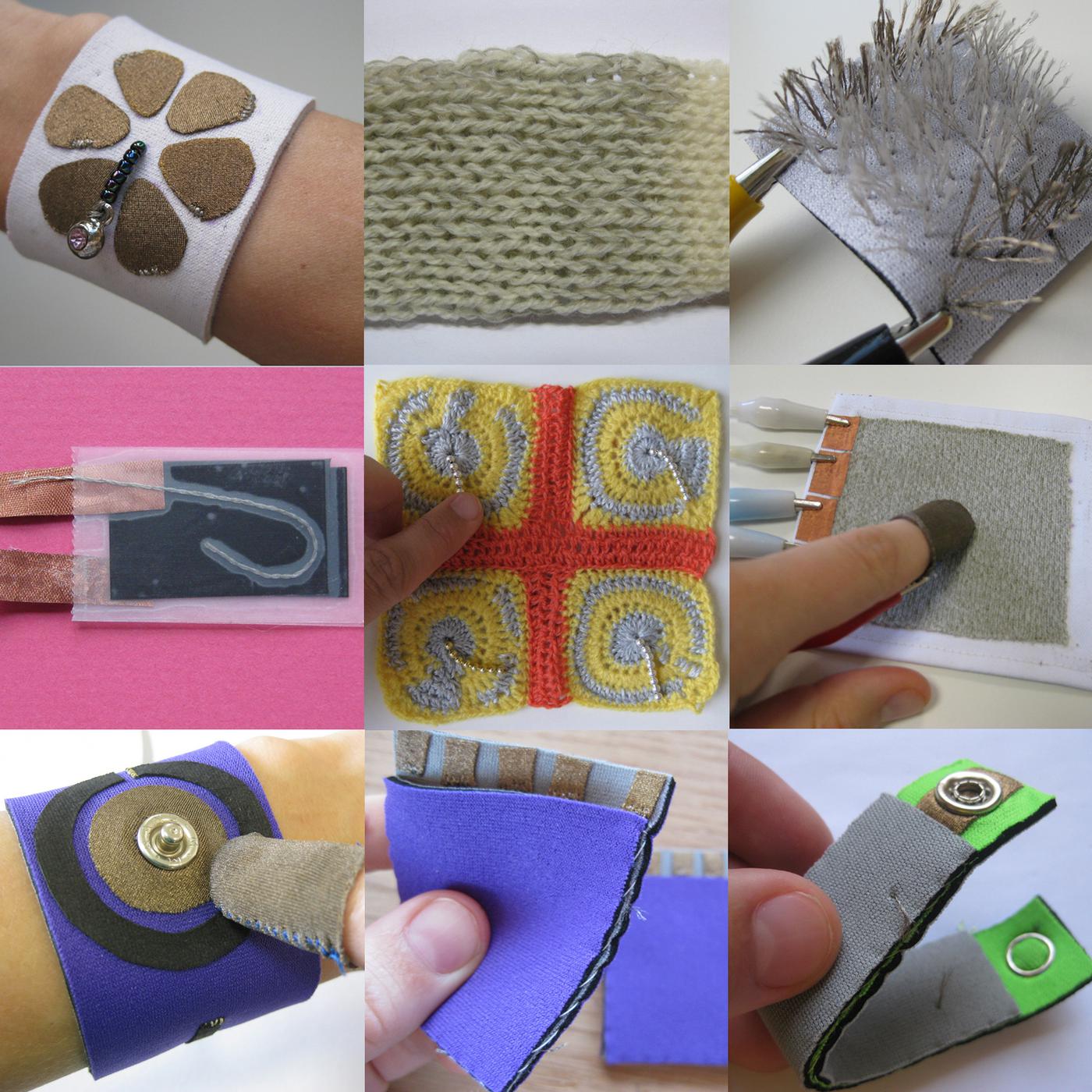 We are exploring ways to build sensors using a variety of crafting and needlework techniques, using affordable and available materials such as conductive threads, yarns, fabrics, and paints. These materials are used to sew, knit, crochet, embroider, and laminate, creating a range of textile-based sensors.