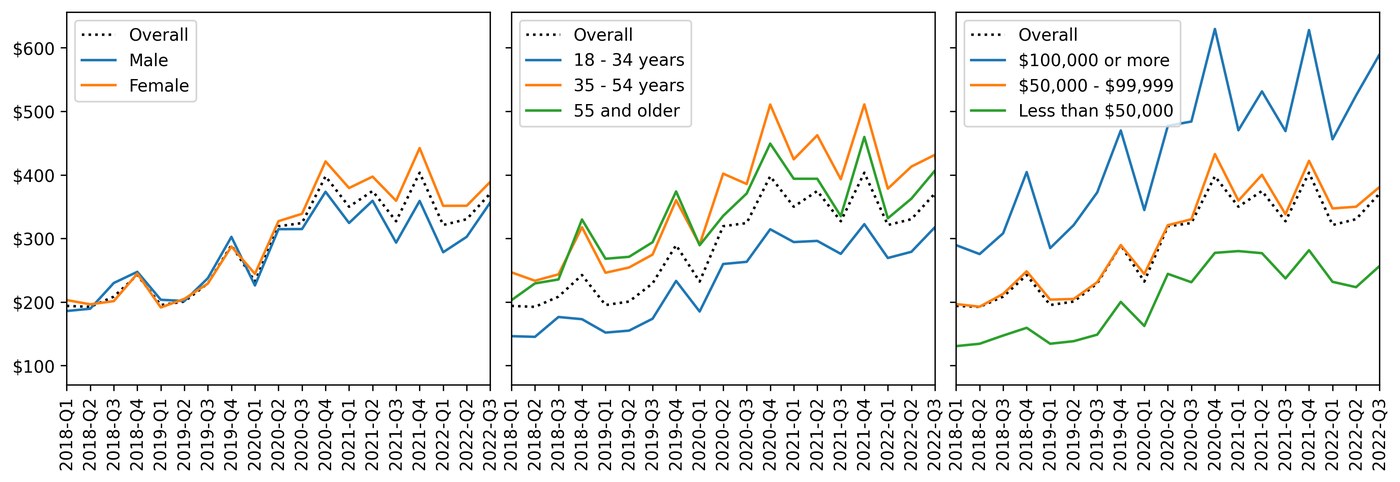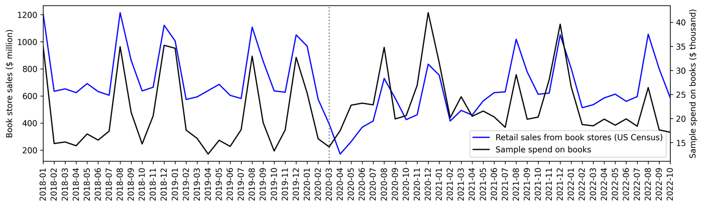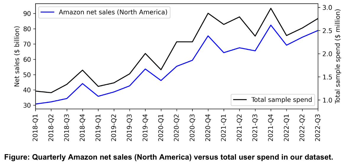 This is a first-of-its-kind dataset containing detailed purchase histories from 5027 U.S. Amazon.com consumers, spanning 2018 through 2022, with more than 1.8 million purchases. Consumer spending data are customarily collected through government surveys to produce public datasets and statistics, which serve public agencies and researchers. Companies now collect similar data through consumers’ use of digital platforms at rates superseding data collection by public agencies. We published this dataset in an effort towards democratizing access to rich data sources routinely used by companies. The data were crowdsourced through an online survey and shared with participants’ informed consent. Data columns include order date, product code, title, price, quantity, and shipping address state. Each purchase history is linked to survey data with information about participants’ demographics, lifestyle, and health. We validate the dataset by showing expenditure correlates with public Amazon sales data (Pearson r = 0.978, p < 0.001) and conduct analyses of specific product categories, demonstrating expected seasonal trends and strong relationships to other public datasets.